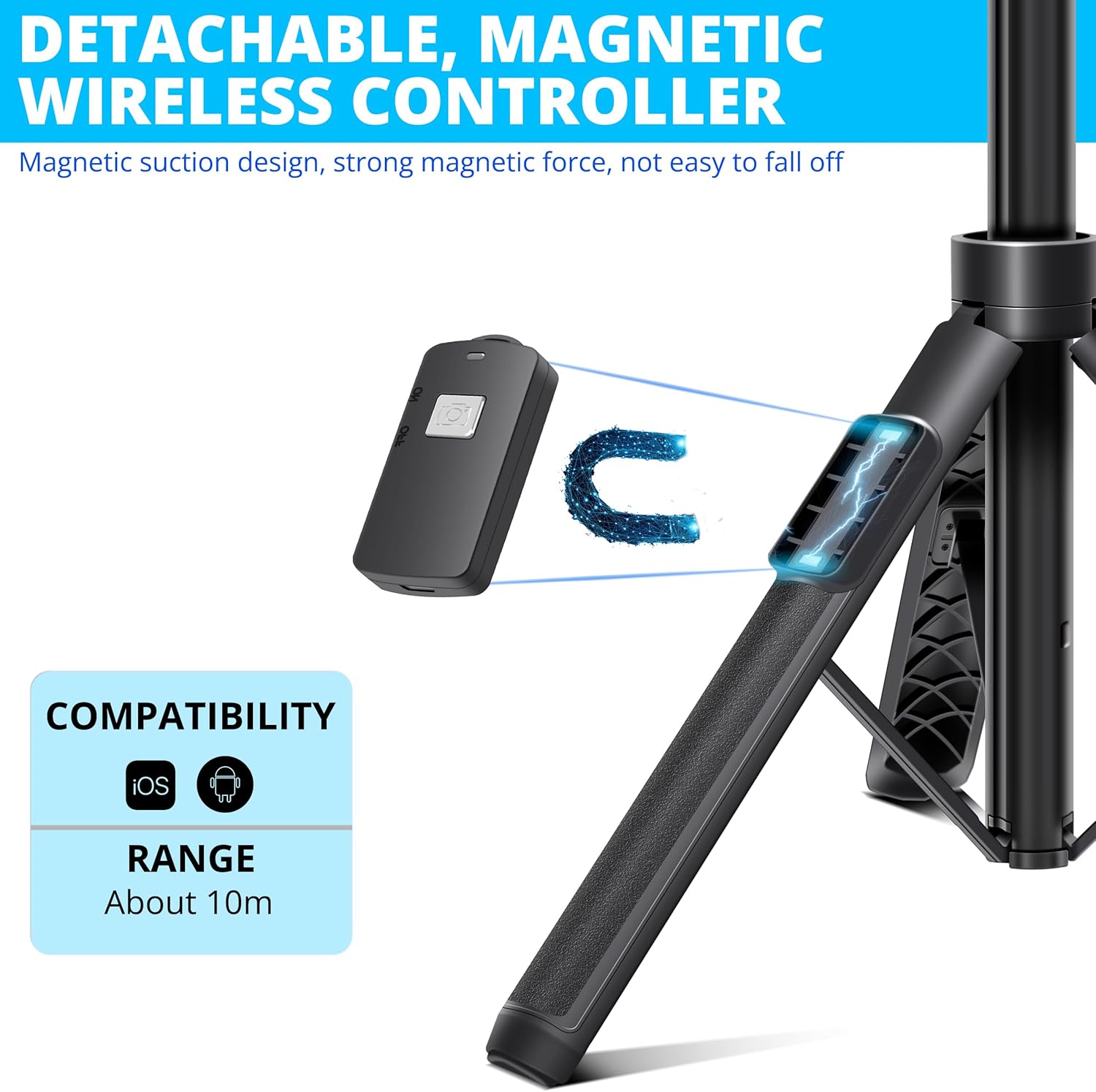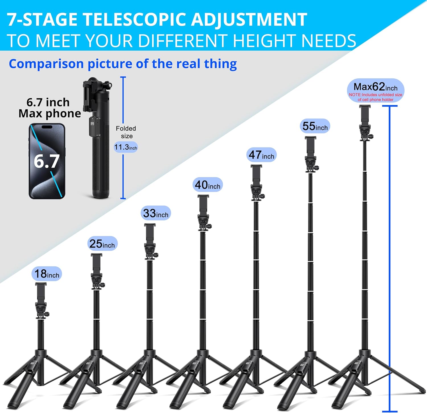 – **62-Inch Extendable Design:** Reach new heights with the fully adjustable selfie stick that extends up to 62 inches. Perfect for wide-angle group shots and breathtaking selfies.